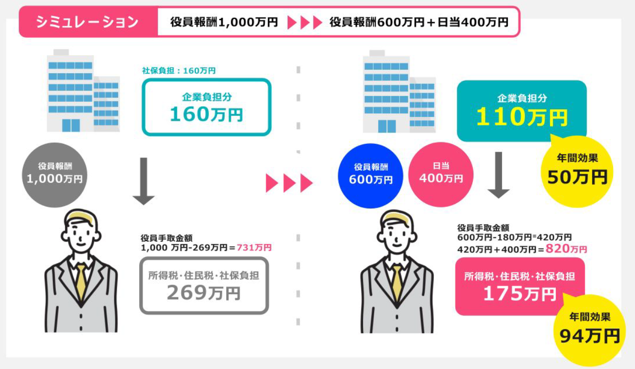 日当は報酬・給与・手当てではないため、所得税・住民税・社会保険料(個人+法人負担分)の対象外となります。